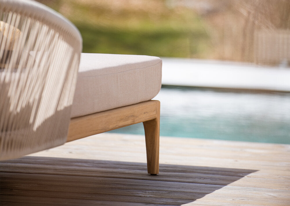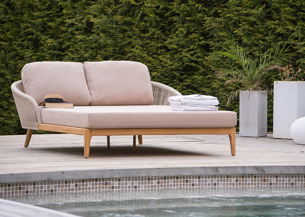 Un lit de repos vraiment confortable dans lequel on peut se blottir et se détendre. La structure est entièrement en teck et le dossier est en corde résistante qui peut supporter les intempéries.